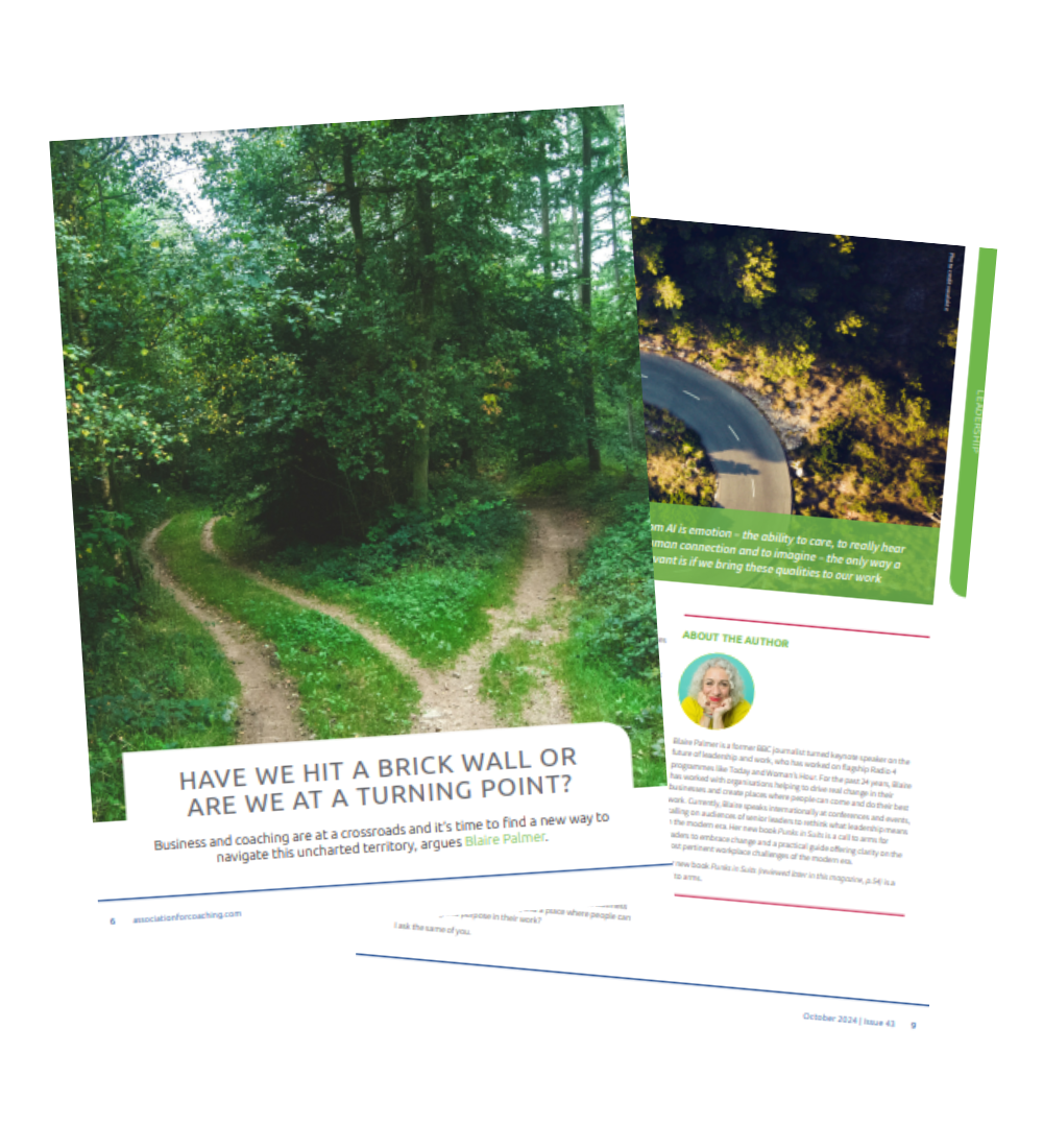Download Blaire’s article belowWe are pleased to offer you a complimentary copy of Blaire Palmers' article on "Have We Hit a Brick Wall or Are We at a Turning Point?" from the Coaching Perspectives magazine. By submitting your details above, you agree to receive regular Digital Learning updates, including our upcoming Member Benefit webinars, the latest podcast releases, and our in-depth programmes. You can unsubscribe at any time. Have We Hit a Brick Wall, or Are We at a Turning Point?An AC Coaching Conversation with Blaire Palmer In this short interview, James Bridgeman is joined by Blaire Palmer to explore the thought-provoking question: "Have We Hit a Brick Wall, or Are We at a Turning Point?"