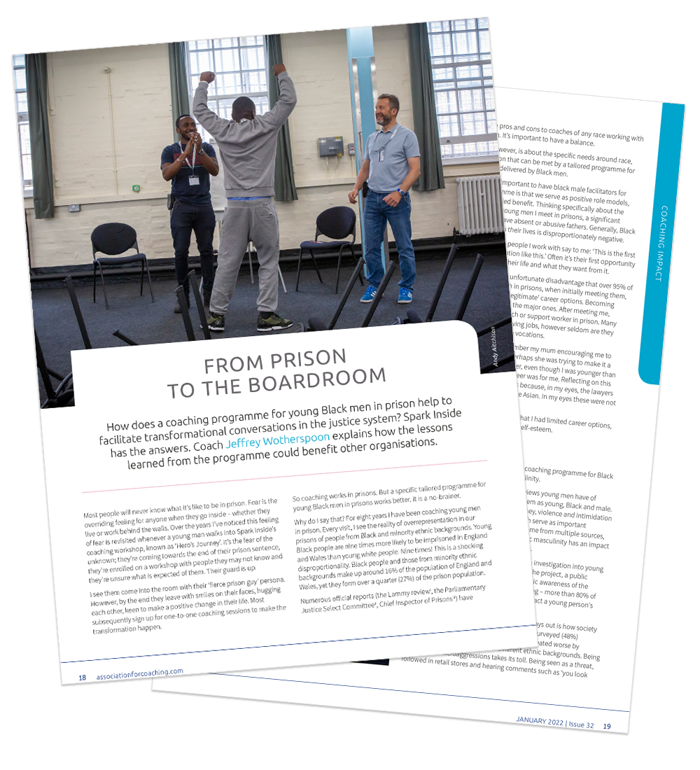 Download Jeffrey’s article belowAs part of our LinkedIn Live interview with Jeffrey Wotherspoon on how does a coaching programme for young Black men in prison help facilitate transformational conversations, we are pleased to offer you a complimentary copy of his article from the latest issue of the Coaching Perspectives magazine. From Prison to the BoardroomAn AC Coaching Conversation with Jeffrey Wotherspoon In this LinkedIn Live interview, James Bridgeman, Deputy Editor of Coaching Perspectives magazine, speaks to Jeffrey Wotherspoon about his work as head coach at Spark Inside and how the lessons learned from the programme he’s running could benefit other organizations. Watch this conversation to discover how a coaching programme for young Black men in prison helps facilitate transformational conversations in the justice system. In this LinkedIn Live interview you will learn: