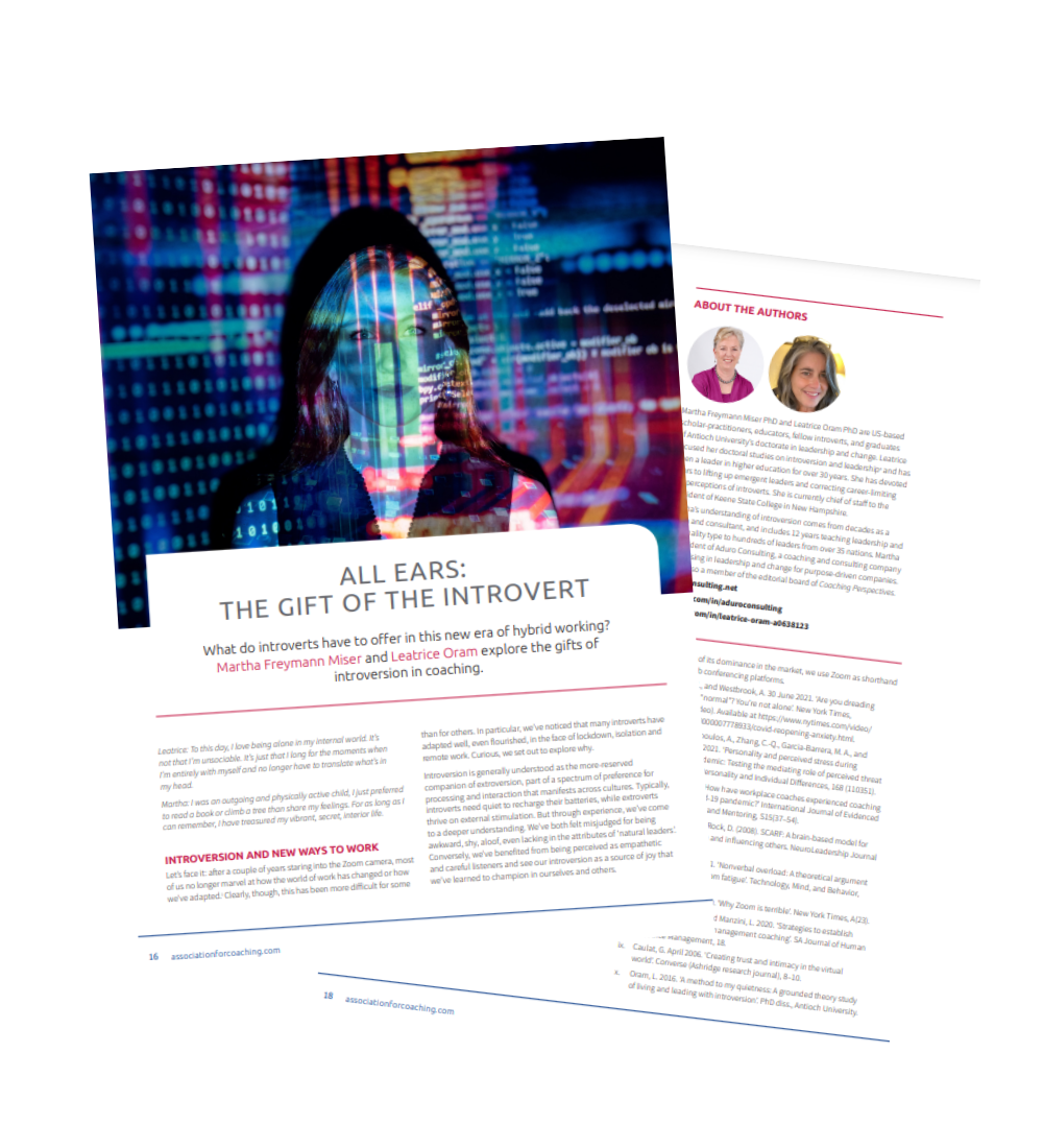 Download Martha’s and Leatrice’s article belowWe are pleased to offer you a complimentary copy of Martha’s and Leatrice’s article on “The Gift of the Introvert” from the latest issue of the Coaching Perspectives magazine. The Gift of the IntrovertAn AC Coaching Conversation with Martha Freymann Miser and Leatrice Oram In this LinkedIn Live interview, James Bridgeman speaks to Martha Freymann Miser and Leatrice Oram about the gifts of introversion in coaching and what introverts have to offer in this new era of hybrid work. Watch this conversation to discover how skilled and empathetic listening is essential for everyone, even more so for introverts, who prefer to process their thoughts and feelings internally. In this LinkedIn Live interview you will learn: