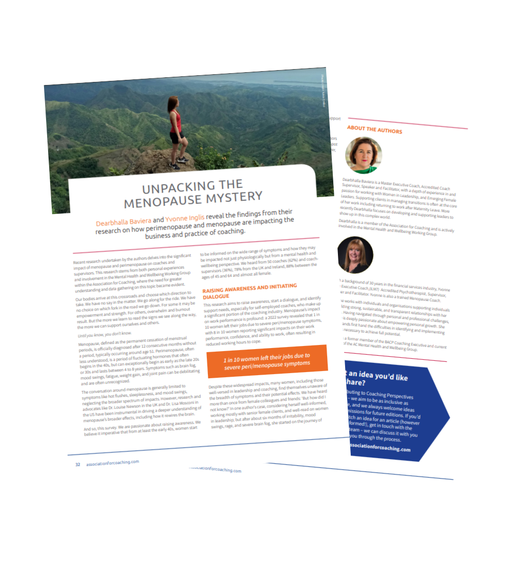 Download Dearbhalla Baviera and Yvonne Inglis' article belowWe are pleased to offer you a complimentary copy of Dearbhalla Baviera and Yvonne Inglis' article on "Unpacking the Menopause Mystery" article from the Coaching Perspectives magazine. By submitting your details above, you agree to receive regular Digital Learning updates, including our upcoming Member Benefit webinars, the latest podcast releases, and our in-depth programmes. You can unsubscribe at any time. Unpacking the Menopause MysteryAn AC Coaching Conversation with Dearbhalla Baviera and Yvonne Inglis "One in ten women leave their jobs due to severe peri/menopause symptoms."